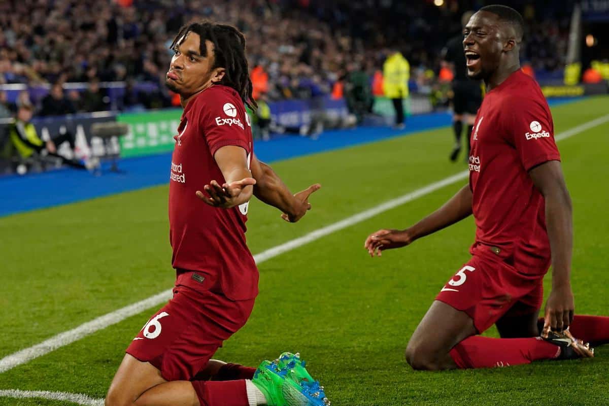 2R1WBJW Leicester, UK. 15th May, 2023. Trent Alexander-Arnold of Liverpool celebrates scoring their third goal during the Premier League match at the King Power Stadium, Leicester. Picture credit should read: Andrew Yates/Sportimage Credit: Sportimage Ltd/Alamy Live News