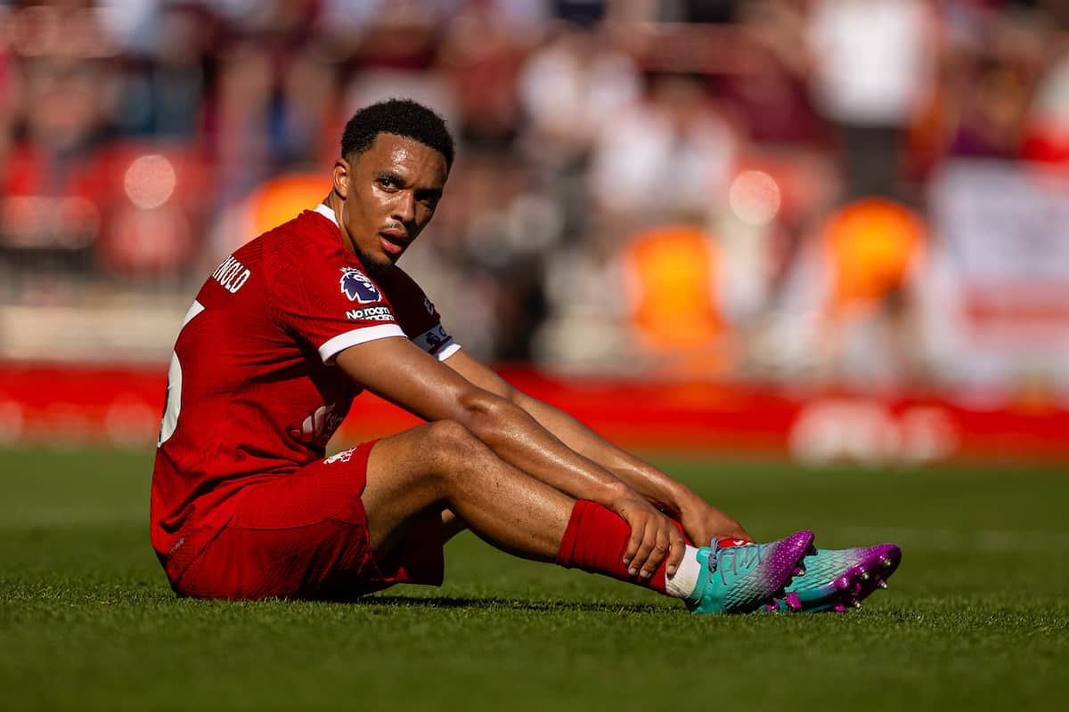 LIVERPOOL, ENGLAND - Saturday, September 2, 2023: Liverpool's Trent Alexander-Arnold goes down injured during the FA Premier League match between Liverpool FC and Aston Villa FC at Anfield. (Pic by David Rawcliffe/Propaganda)