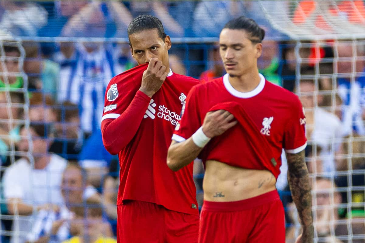 BRIGHTON & HOVE, ENGLAND - Sunday, October 8, 2023: Liverpool's captain Virgil van Dijk (L) and Darwin Núñez look dejected as Brighton & Hove Albion score an equalising goal to level the score 2-2 during the FA Premier League match between Brighton & Hove Albion FC and Liverpool FC at the American Express Community Stadium. (Pic by David Rawcliffe/Propaganda)