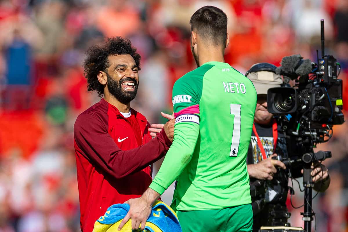 LIVERPOOL, ENGLAND - Saturday, August 19, 2023: Liverpool's Mohamed Salah shakes hands with Bournemouth's goalkeeper Norberto Murara Neto after the FA Premier League match between Liverpool FC and AFC Bournemouth at Anfield. Liverpool won 3-1. (Pic by David Rawcliffe/Propaganda)
