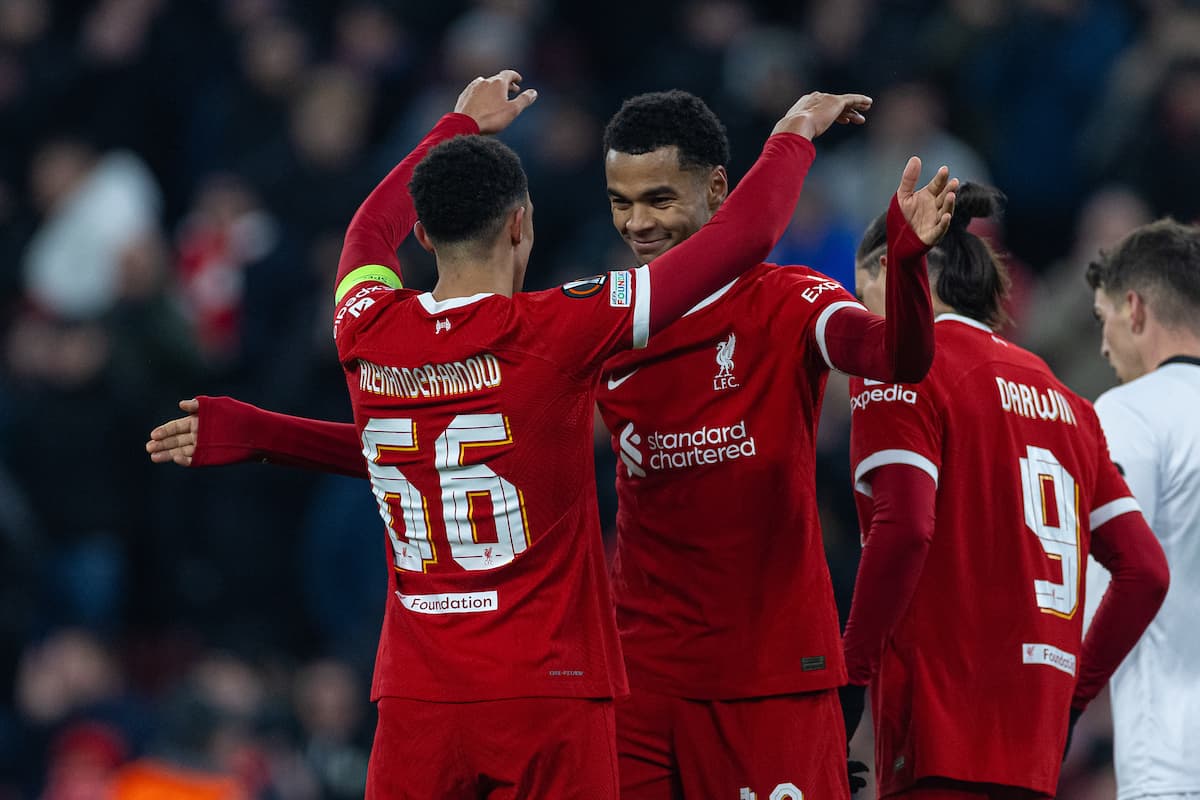 LIVERPOOL, ENGLAND - Thursday, November 30, 2023: Liverpool's Cody Gakpo (R) celebrates after scoring the fourth goal during the UEFA Europa League Group E matchday 5 game between Liverpool FC and LASK at Anfield. (Photo by David Rawcliffe/Propaganda)