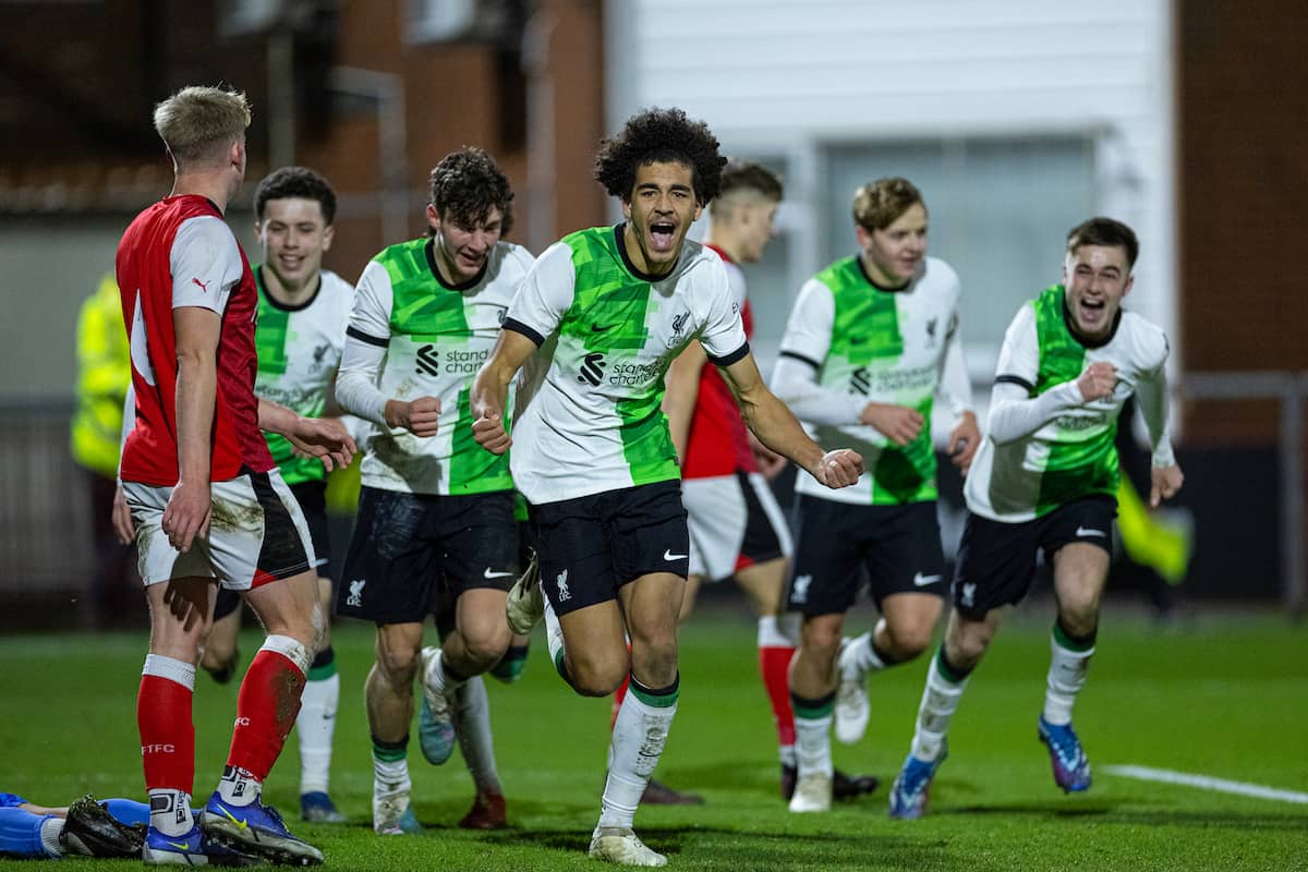 FLEETWOOD, ENGLAND - Tuesday, December 19, 2023: Liverpool's Jayden Danns (C) celebrates after scoring the winning second goal in injury time during the FA Youth Cup 3rd Round match between Fleetwood Town FC Under-18's and Liverpool FC Under-18's at Highbury Stadium. Liverpool won 2-1. (Photo by David Rawcliffe/Propaganda)