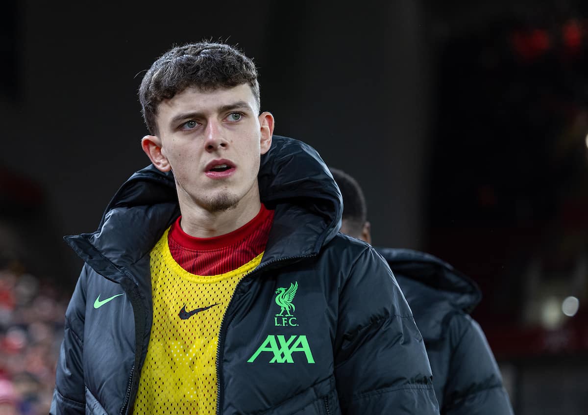 LIVERPOOL, ENGLAND - Wednesday, January 10, 2024: Liverpool's substitute Owen Beck before the Football League Cup Semi-Final 1st Leg match between Liverpool FC and Fulham FC at Anfield. (Photo by David Rawcliffe/Propaganda)