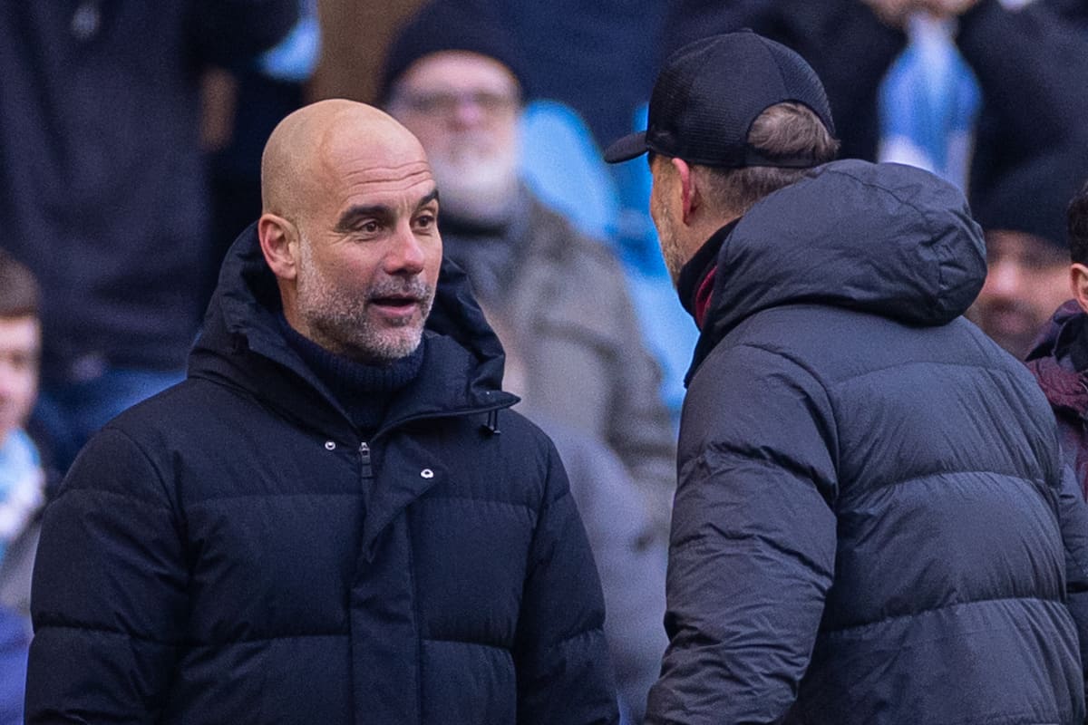 MANCHESTER, ENGLAND - Saturday, November 25, 2023: Manchester City's manager Josep 'Pep' Guardiola (L) and Liverpool's manager Jürgen Klopp speak after the FA Premier League match between Manchester City FC and Liverpool FC at the City of Manchester Stadium. (Photo by David Rawcliffe/Propaganda)
