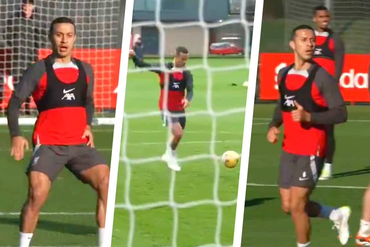 It is over nine months since Thiago’s last appearance for Liverpool, and finally back in full training, the Spanish midfielder is looking sharp on the ball.