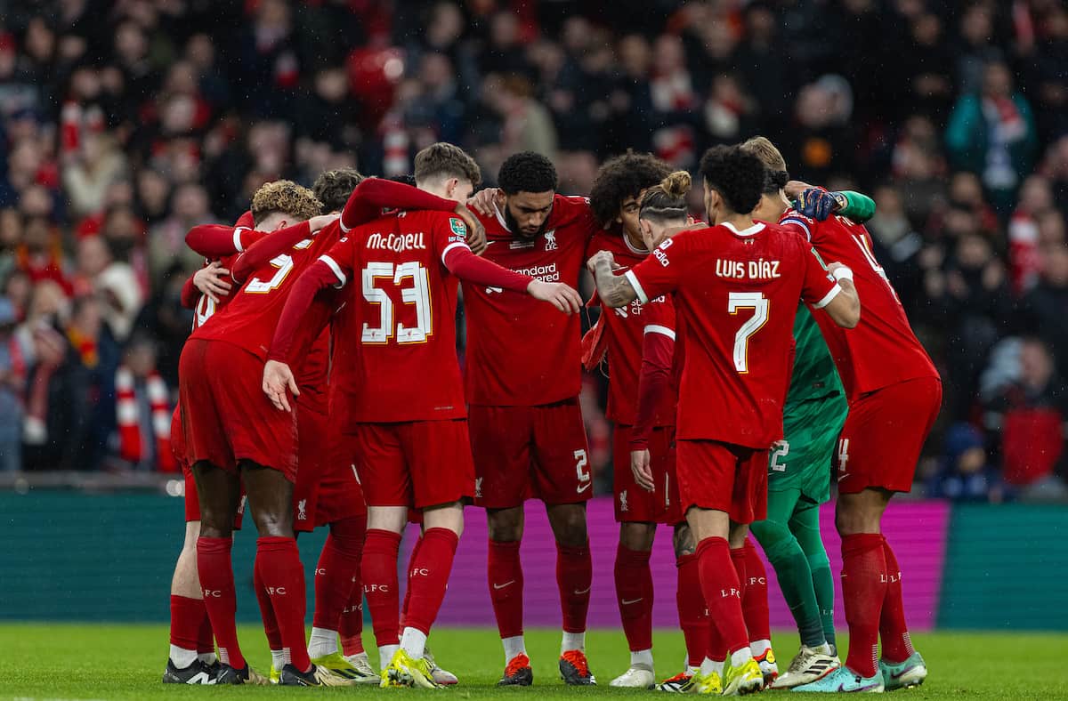 LONDON, ENGLAND - Sunday, February 25, 2024: Liverpool players form a team huddle before the start of extra-time during the Football League Cup Final match between Chelsea FC and Liverpool FC at Wembley Stadium. Liverpool won 1-0 after extra-time. (Photo by David Rawcliffe/Propaganda)
