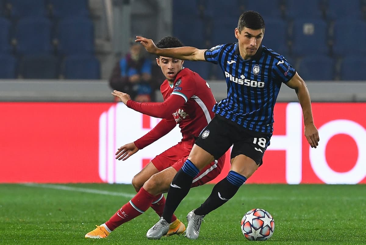 BERGAMO, ITALY - Tuesday, November 3, 2020: Atalanta's Ruslan Malinovskyi gets away from Liverpool's Curtis Jones during the UEFA Champions League Group D match between Atalanta BC and Liverpool FC at the Stadio di Bergamo. (Pic by Simone Arveda/Propaganda)
