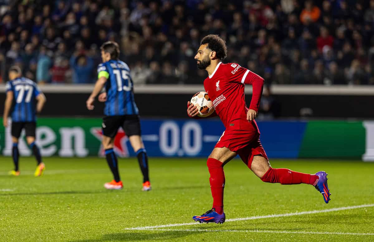 BERGAMO, ITALY - Thursday, April 18, 2024: Liverpool's Mohamed Salah runs back with the ball after scoring the first goal from a penalty kick during the UEFA Europa League Quarter-Final 2nd Leg match between BC Atalanta and Liverpool FC at the Stadio Atleti Azzurri d'Italia. (Photo by David Rawcliffe/Propaganda)