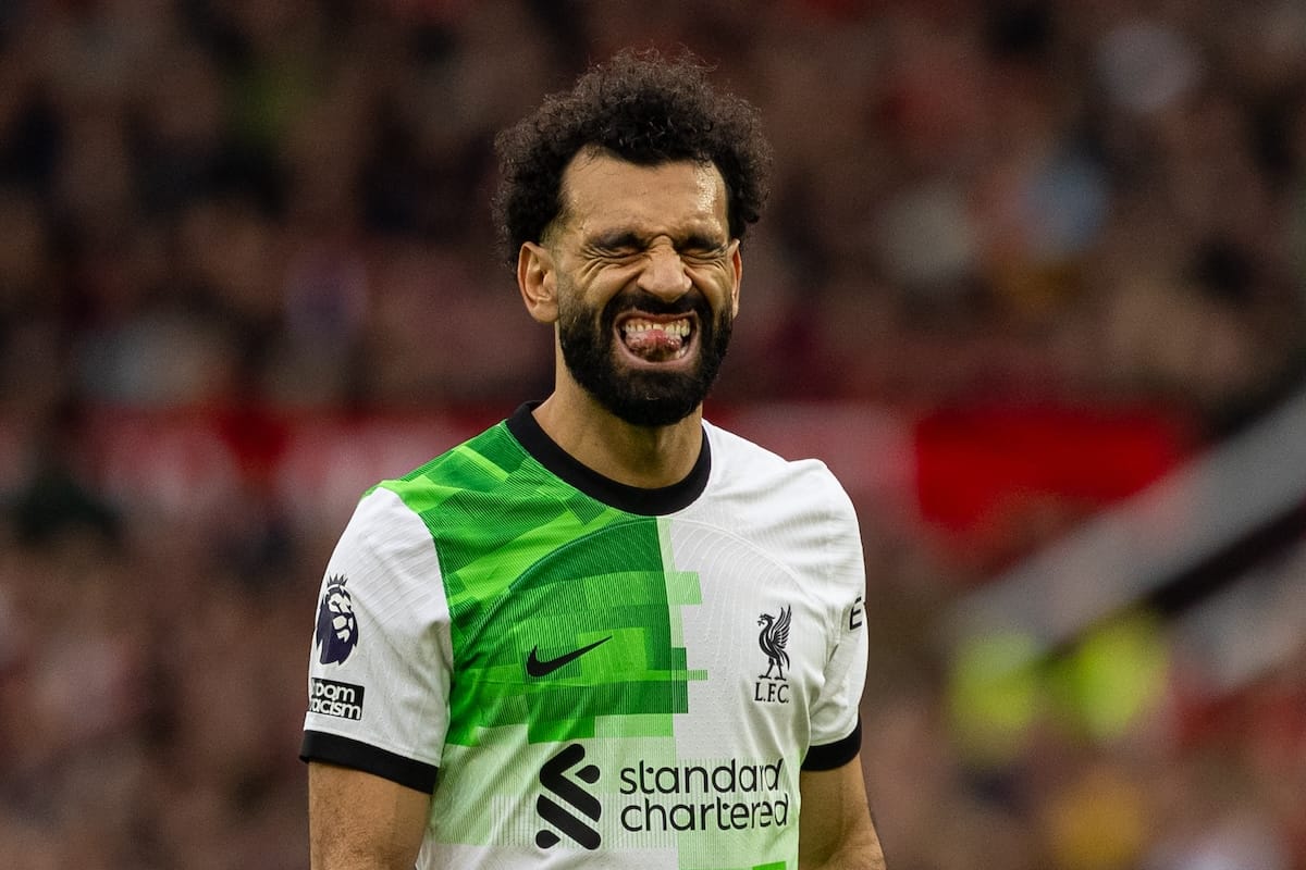 MANCHESTER, ENGLAND - Sunday, April 7, 2024: Liverpool's Mohamed Salah reacts after missing a chance during the FA Premier League match between Manchester United FC and Liverpool FC at Old Trafford. (Photo by David Rawcliffe/Propaganda)