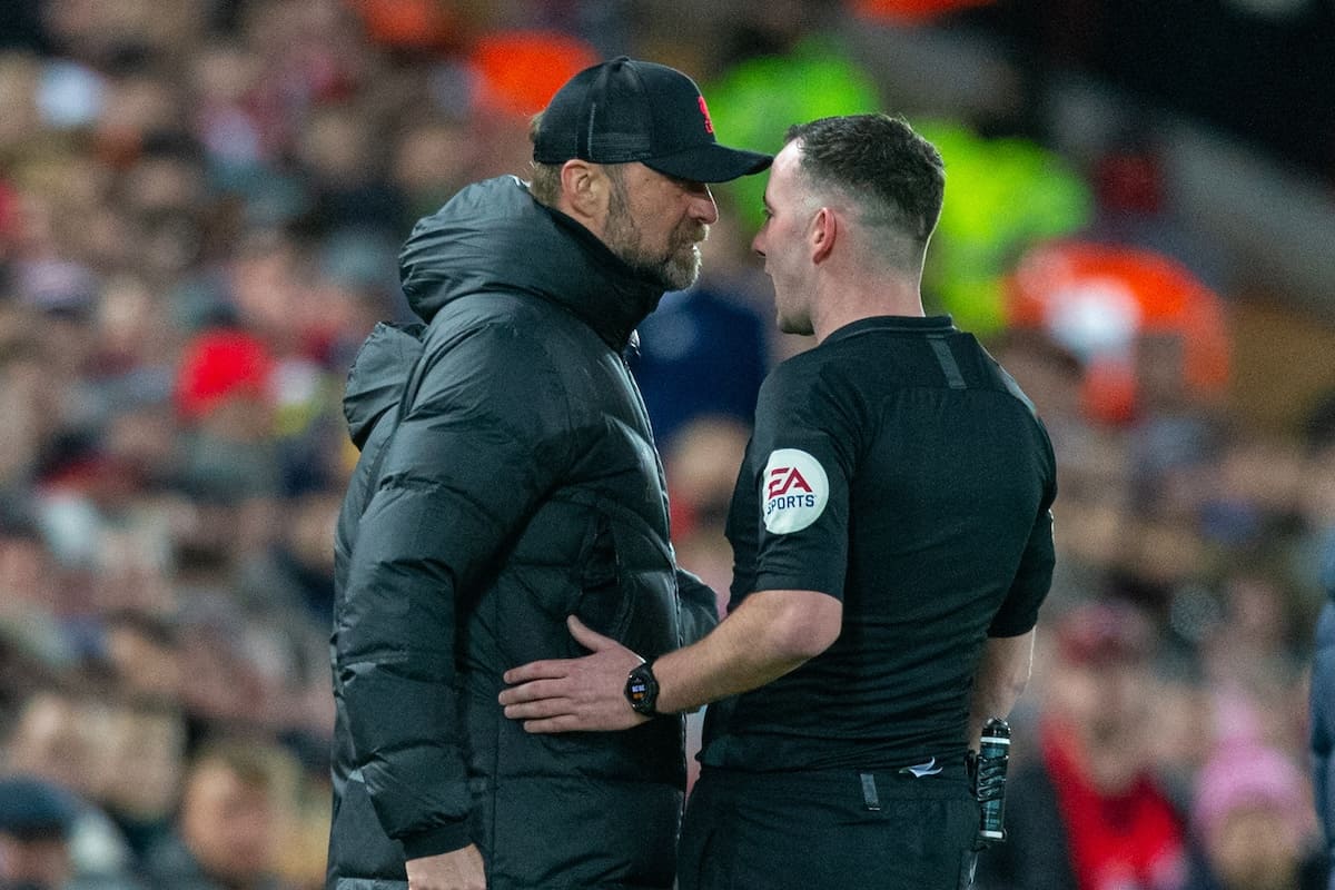 LIVERPOOL, ENGLAND - Sunday, March 10, 2024: Liverpool's manager Jürgen Klopp speaks to referee Michael Oliver after the FA Premier League match between Liverpool FC and Manchester City FC at Anfield. (Photo by David Rawcliffe/Propaganda)
