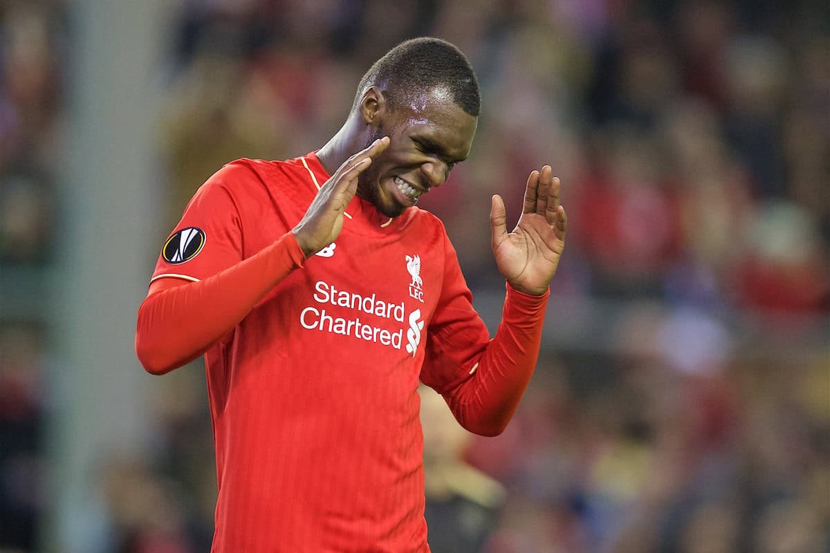 LIVERPOOL, ENGLAND - Thursday, October 22, 2015: Liverpool's Christian Benteke looks dejected after missing a chance against Rubin Kazan during the UEFA Europa League Group Stage Group B match at Anfield. (Pic by David Rawcliffe/Propaganda)