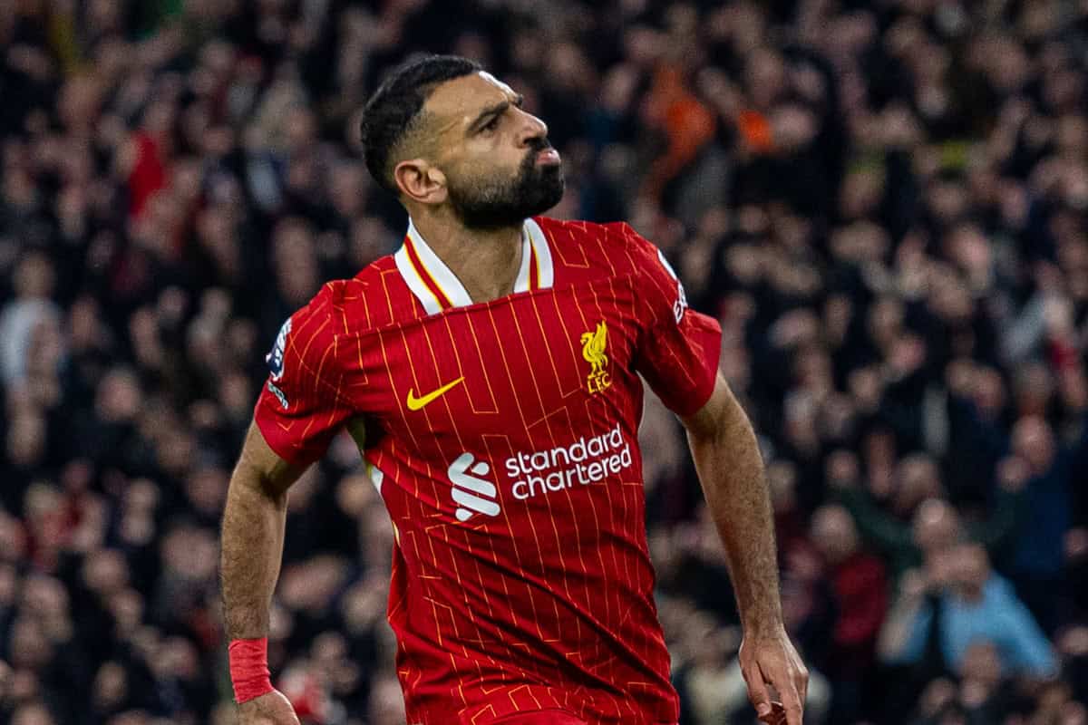LIVERPOOL, ENGLAND - Saturday, November 2, 2024: Liverpool's Mohamed Salah celebrates after scoring the second goal during the FA Premier League match between Liverpool FC and Brighton & Hove Albion FC at Anfield. (Photo by David Rawcliffe/Propaganda)