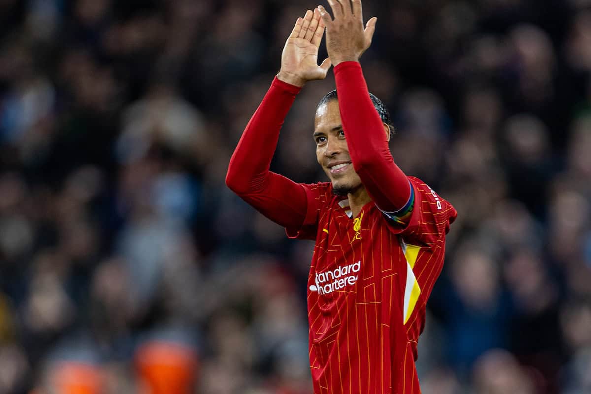 LIVERPOOL, ENGLAND - Sunday, December 1, 2024: Liverpool's captain Virgil van Dijk applauds the supporters after the FA Premier League match between Liverpool FC and Manchester City FC at Anfield. Liverpool won 2-0. (Photo by David Rawcliffe/Propaganda)