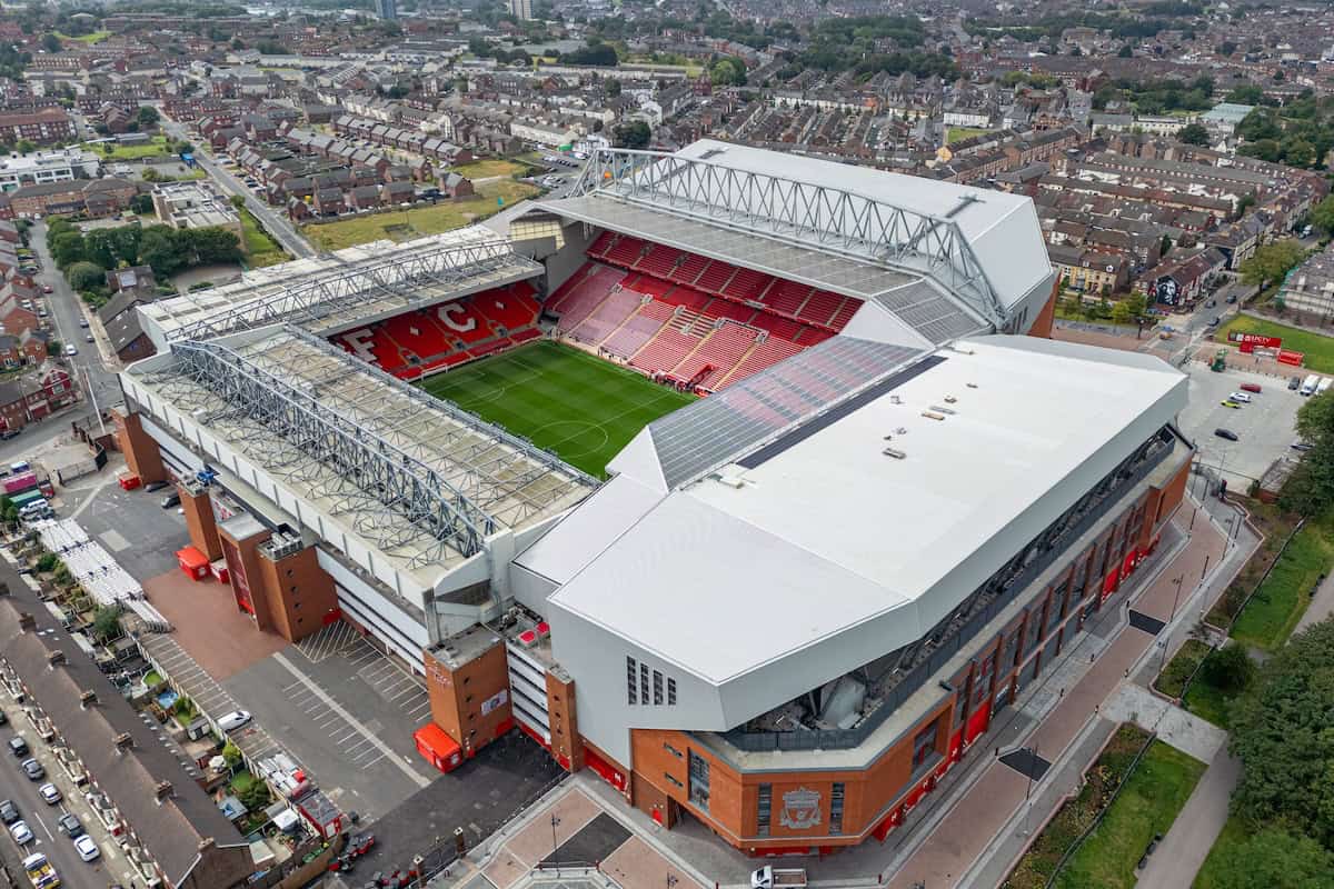 LIVERPOOL, ENGLAND - Saturday, August 31, 2024: An aerial view of Anfield, the home stadium of Liverpool Football Club, showing the newly redeveloped Anfield Road stand. The redevelopment of the stand saw an additional 7,000 more seats added taking Anfield's overall capacity to more than 61,000. (Photo by David Rawcliffe/Propaganda)