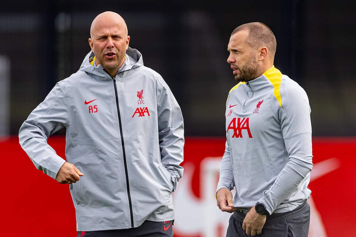 LIVERPOOL, ENGLAND - Tuesday, October 1, 2024: Liverpool's head coach Arne Slot with assistant coach John Heitinga (R) during a training session at the AXA Training Centre ahead of the UEFA Champions League match between Liverpool FC and Bologna FC. (Photo by David Rawcliffe/Propaganda)