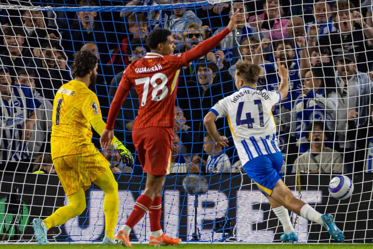 BRIGHTON & HOVE, ENGLAND - Monday, May 19, 2025: Liverpool's Jarell Quansah protests as Brighton & Hove Albion's Jack Hinshelwood celebrates after scoring the third goal during the FA Premier League match between Brighton & Hove Albion FC and Liverpool FC at the American Express Community Stadium. (Photo by David Rawcliffe/Propaganda)
