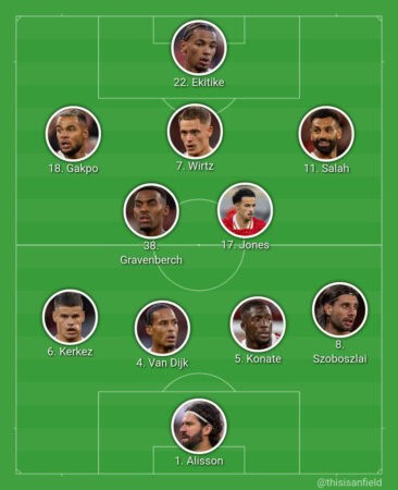 Liverpool: Alisson; Szoboszlai, Konate, Van Dijk, Kerkez; Gravenberch, Jones; Salah, Wirtz, Gakpo; Ekitike