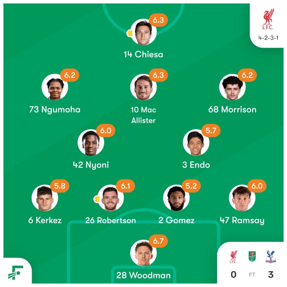 According to our friends at FotMob, Freddie Woodman (6.7) was statistically Liverpool’s best player on his debut, even though he conceded three goals.