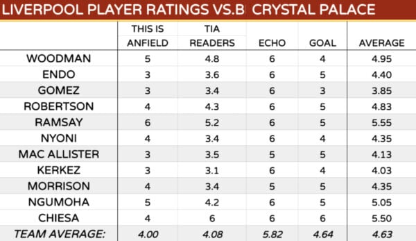 Joe Gomez got the worst rating in Liverpool’s bleak 3-0 defeat at home to Crystal Palace, as the defender struggled to find his feet in only his second start of the season.