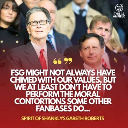 “Personally, I find the idea of a despotic nation-state owning the club abhorrent. FSG might not always have chimed with our values, but we at least don’t have to perform the moral contortions some other fanbases do to justify their direction.