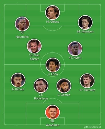 Liverpool: Woodman; Ramsay, Gomez, Robertson, Kerkez; Endo, Nyoni; Morrison, Mac Allister, Ngumoha; Chiesa