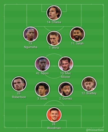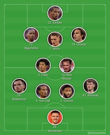 Woodman; Ramsay; Gomez, Van Dijk, Robertson; Endo, Mac Allister; Chiesa, Wirtz, Ngumoha; Ekitike