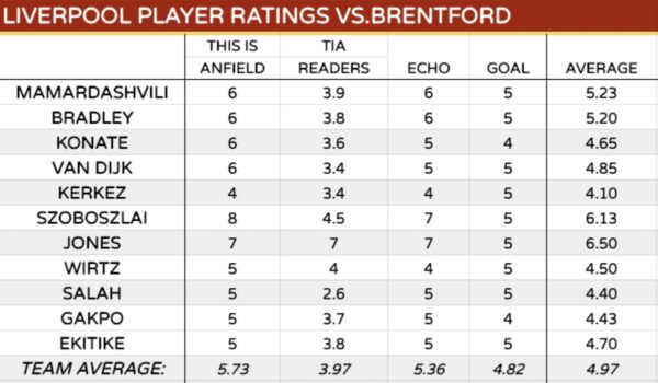Here we compare our ratings with those of TIA’s readers, the Liverpool Echo and GOAL.