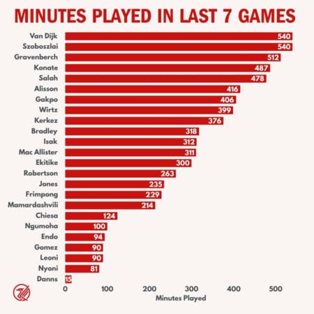 But with that in mind, it is evident who is first in Slot’s plans and who remains firmly on the periphery, with the total minutes over the last seven games also indicating who may soon need a break: