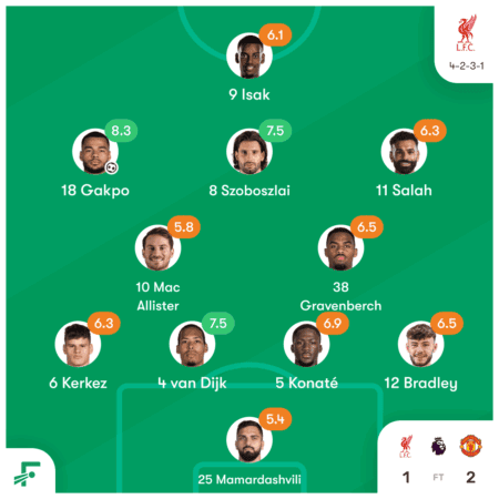 Very few Liverpool players came away with any credit after losing 2-1 to home to Man United, with Milos Kerkez enduring another bad performance.