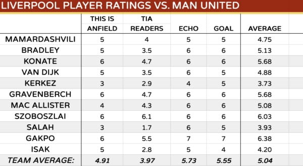 Here we compare our ratings with those of TIA’s readers, the Liverpool Echo and GOAL.