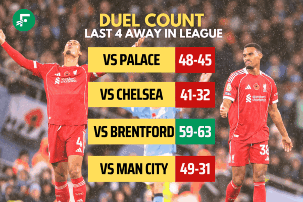 At the Etihad, only Conor Bradley (7/13), Andy Robertson (3/4), Virgil van Dijk (3/4) and substitute Federico Chiesa (1/1) won more duels than they lost.
