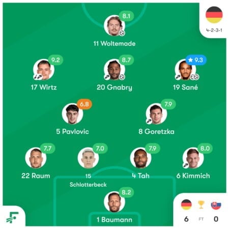 He was involved in the joint-most duels for Germany (six), winning three of those – also the joint-most – with two tackles and one successful dribble.
